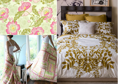 we've been searching for sheets for a while now but are struggling to find what we want. ideally we'd like them to be organic cotton, we want to stay away from the white, and I'd love a bold pattern like the one above in gold, from .dwell studio. I've also taken a fancy for a particular.amy butler fabric., which I think has the perfect color combination for our bedroom. making a quilt is much too ambitious although I love the one in the photos. but maybe I could make my own duvet cover in this fabric?